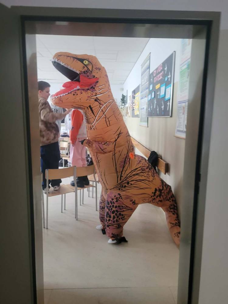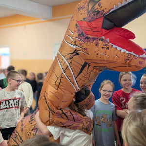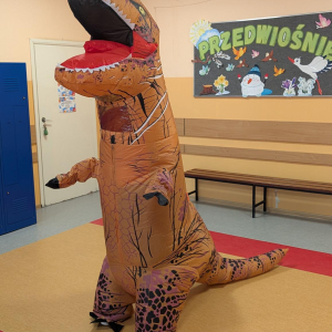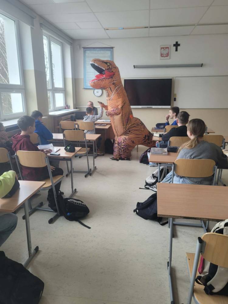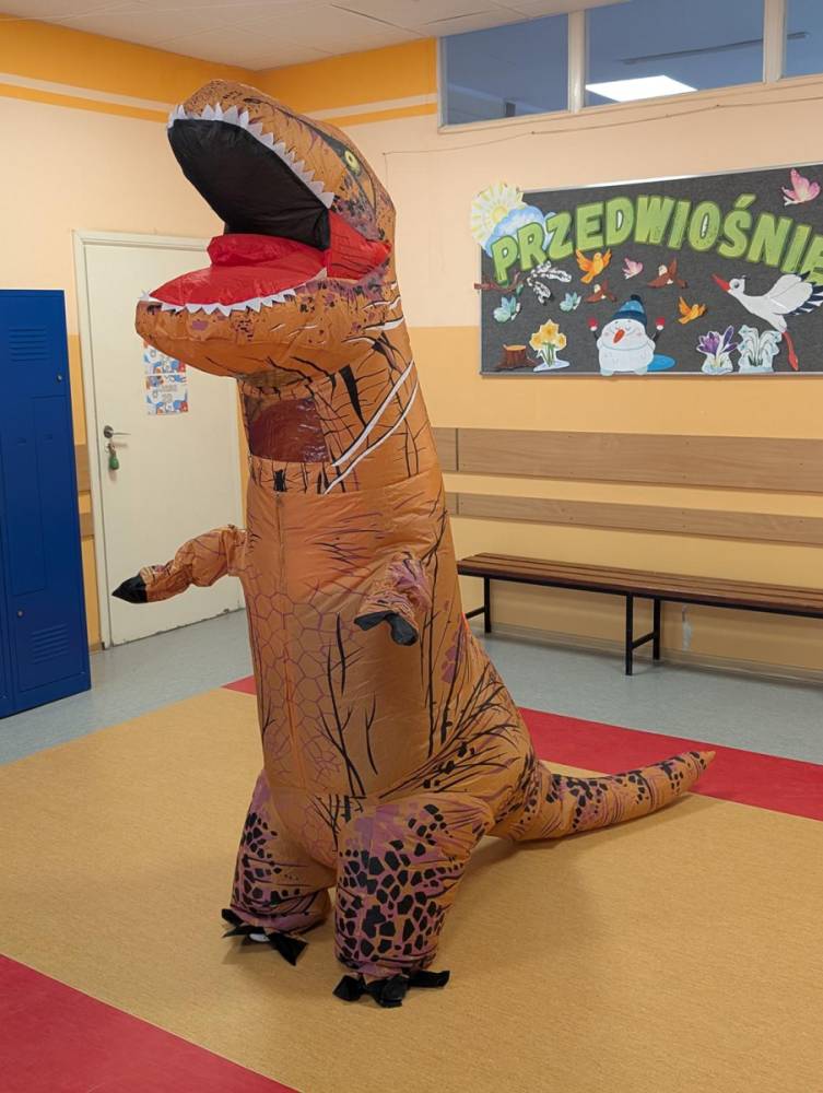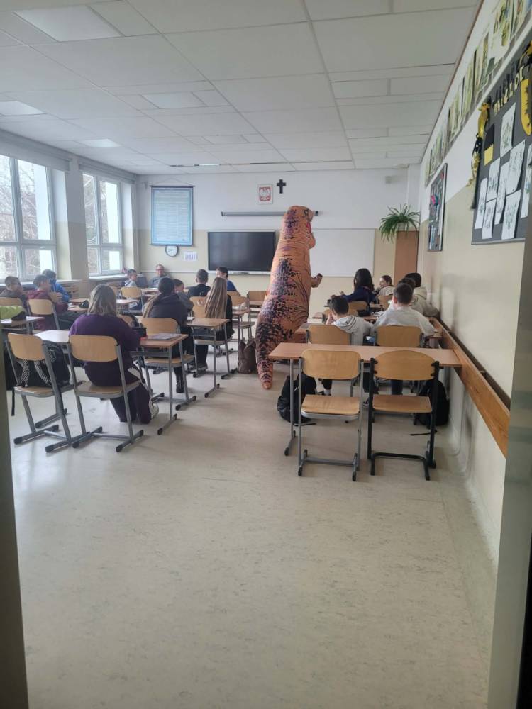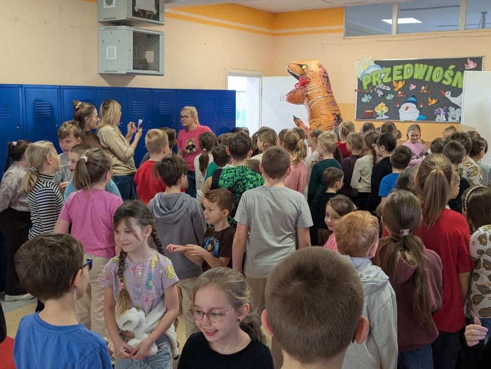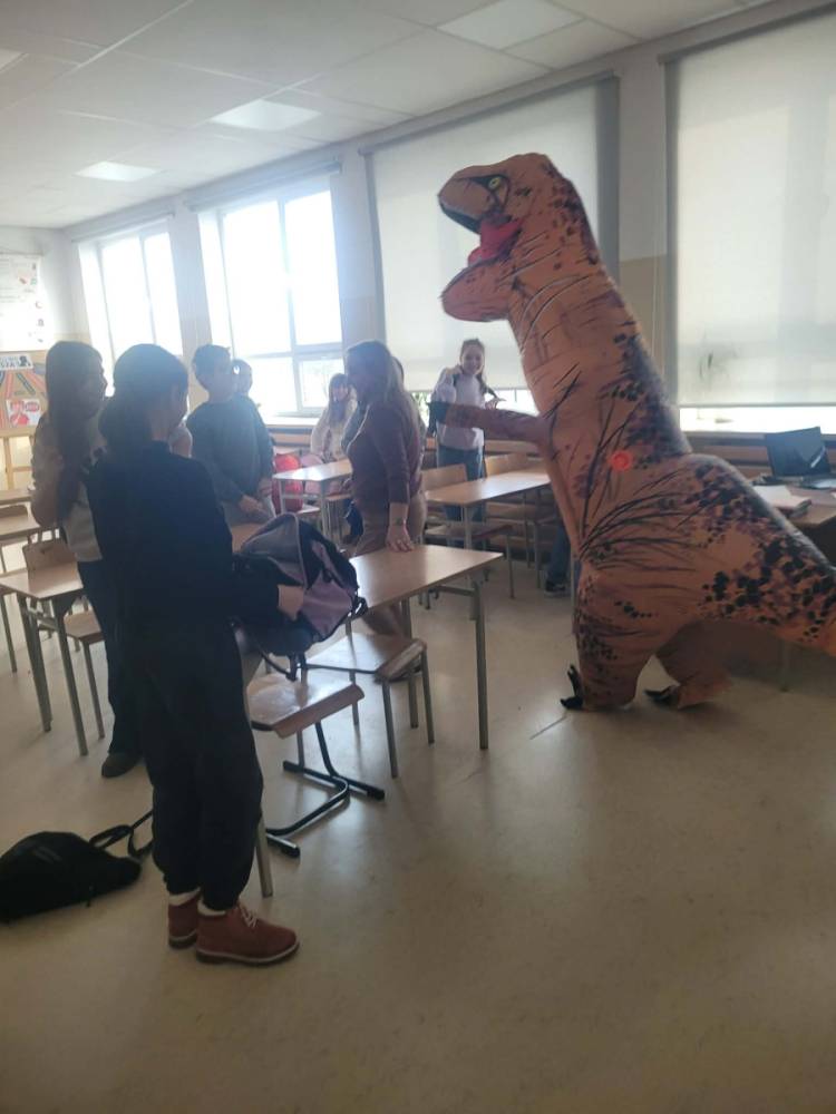 W naszej szkole odbył się wyjątkowy i pełen emocji Dzień Dinozaura. Największą atrakcją tego dnia była niezwykła wizyta prawdziwego gościa – samego dinozaura! Niespodziewany przybysz odwiedził wszystkie klasy oraz nauczycieli, wzbudzając ogromne zainteresowanie i radość wśród uczniów. W każdej sali rozlegały się śmiechy, okrzyki zaskoczenia i głośne brawa. Spotkanie z dinozaurem było dla dzieci wielką niespodzianką i niezapomnianym przeżyciem. Uczniowie chętnie robili sobie pamiątkowe zdjęcia, zadawali pytania i z zachwytem obserwowali niezwykłego gościa. W całej szkole panowała radosna atmosfera pełna uśmiechów i pozytywnej energii.