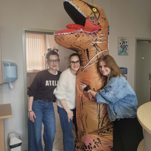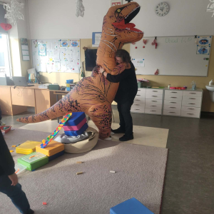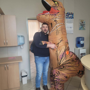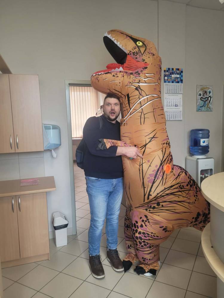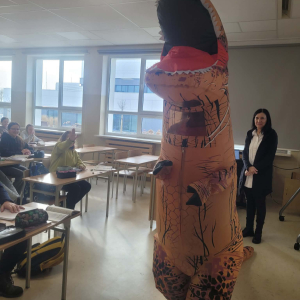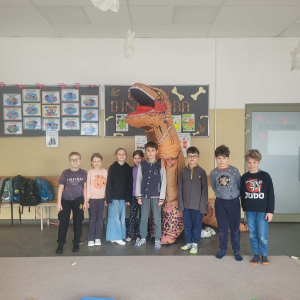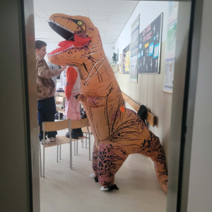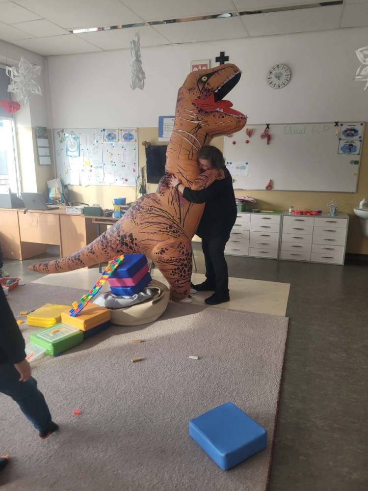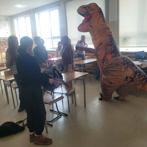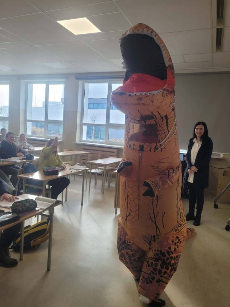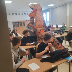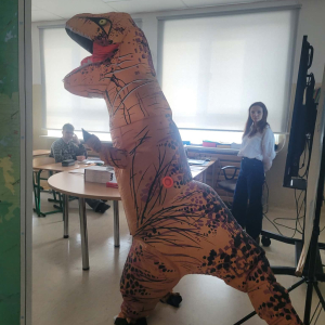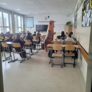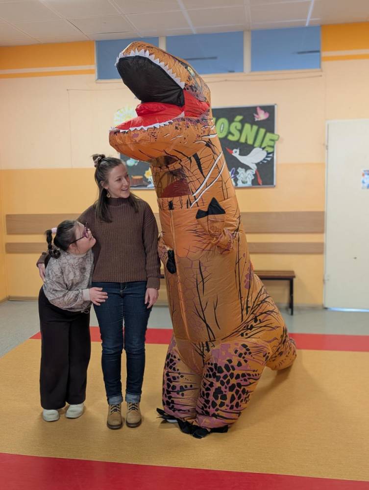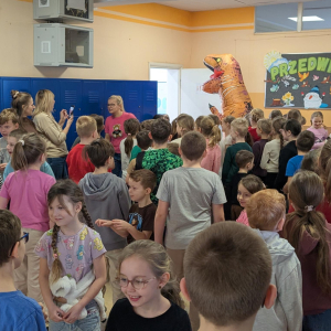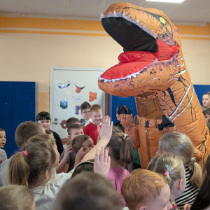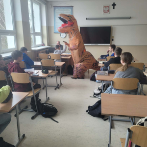 W naszej szkole odbył się wyjątkowy i pełen emocji Dzień Dinozaura. Największą atrakcją tego dnia była niezwykła wizyta prawdziwego gościa – samego dinozaura! Niespodziewany przybysz odwiedził wszystkie klasy oraz nauczycieli, wzbudzając ogromne zainteresowanie i radość wśród uczniów. W każdej sali rozlegały się śmiechy, okrzyki zaskoczenia i głośne brawa. Spotkanie z dinozaurem było dla dzieci wielką niespodzianką i niezapomnianym przeżyciem. Uczniowie chętnie robili sobie pamiątkowe zdjęcia, zadawali pytania i z zachwytem obserwowali niezwykłego gościa. W całej szkole panowała radosna atmosfera pełna uśmiechów i pozytywnej energii.