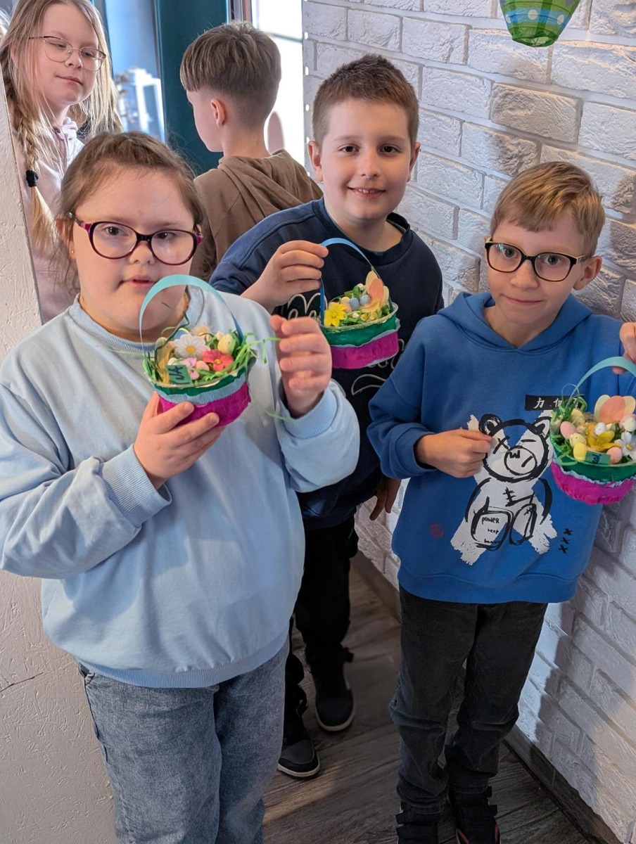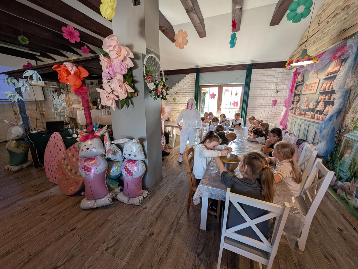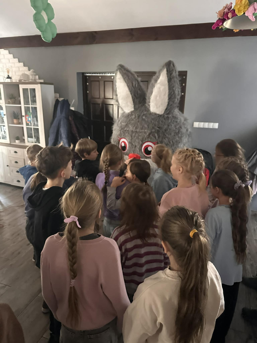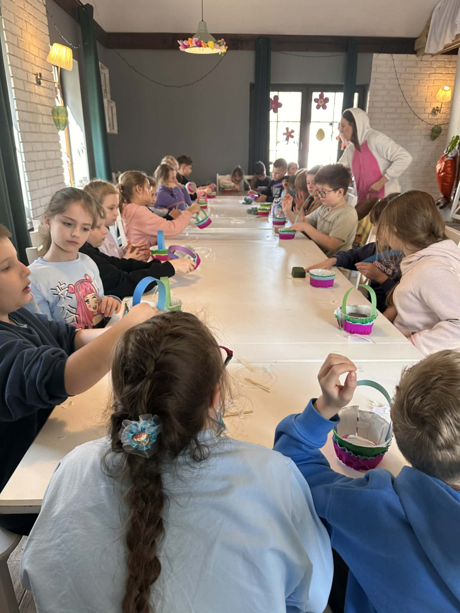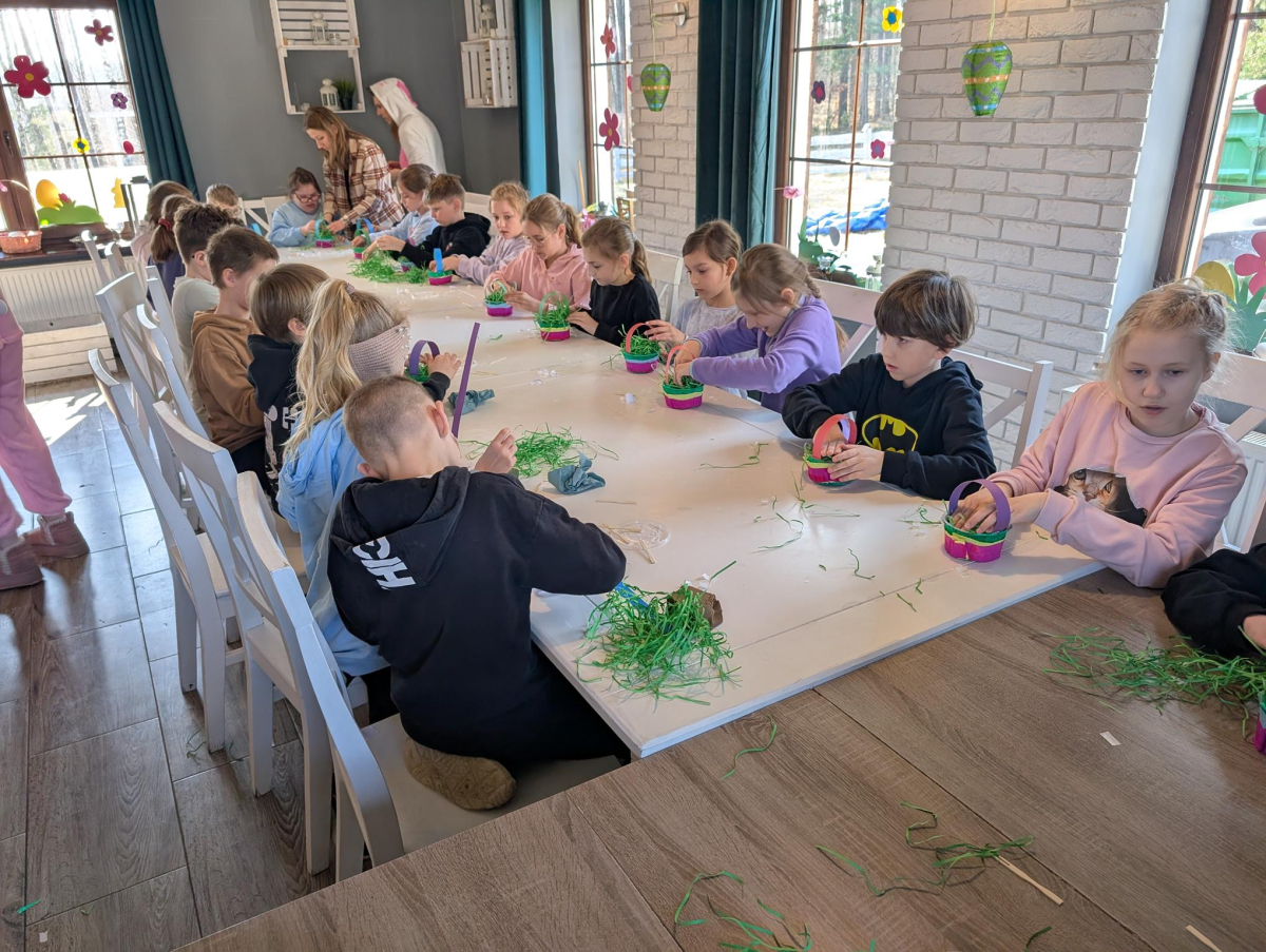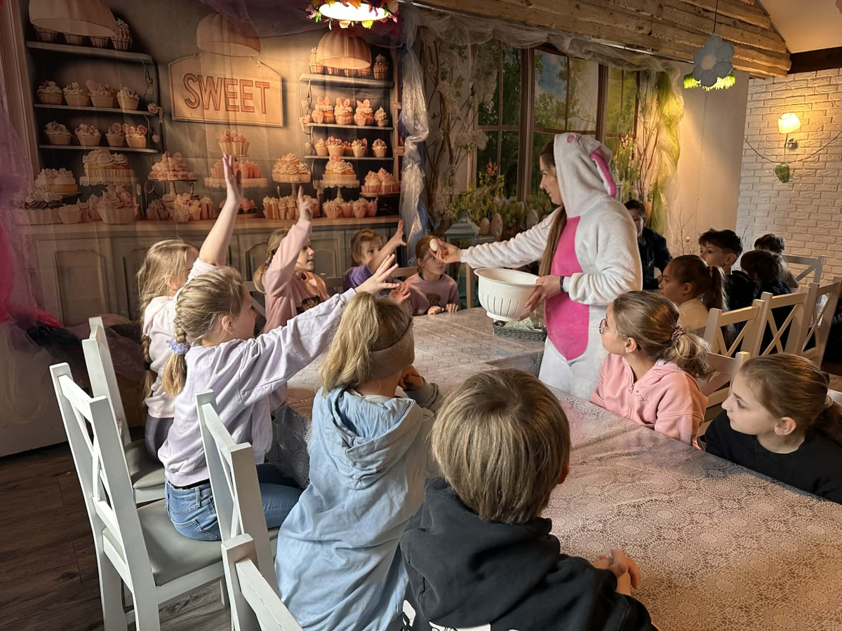 Na uczestników wycieczki czekało mnóstwo atrakcji – pieczenie babeczek, własnoręczne tworzenie koszyków wielkanocnych, a także gry i zabawy na świeżym powietrzu. Uczniowie uczestniczyli również w zabawie terenowej, rozwiązując wielkanocne zagadki oraz tańczyli z wielkanocnym zajączkiem.