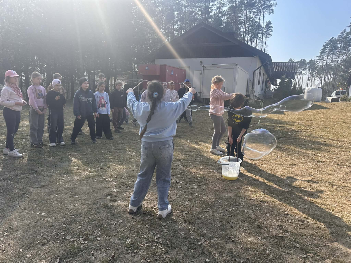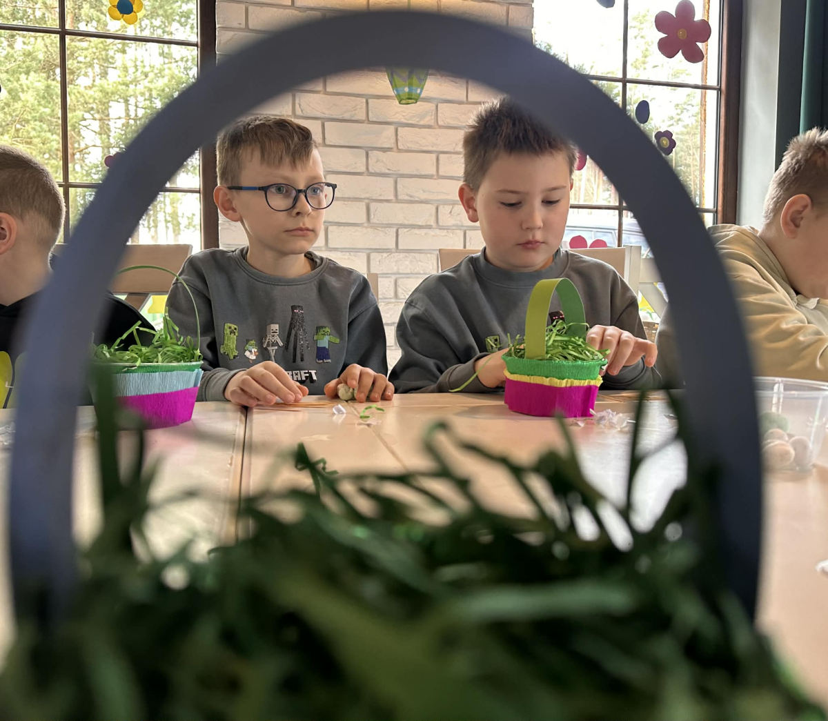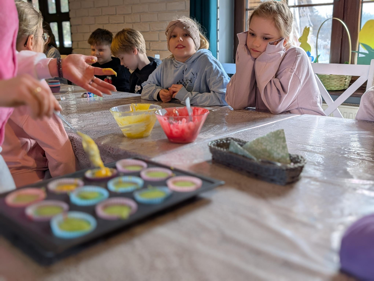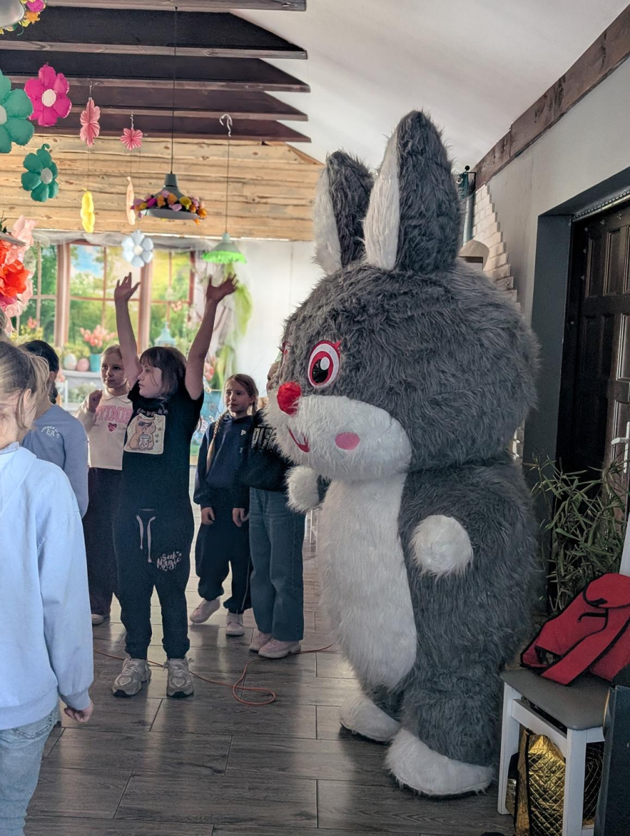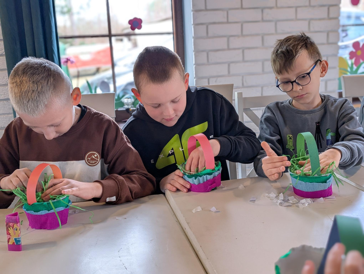 Na uczestników wycieczki czekało mnóstwo atrakcji – pieczenie babeczek, własnoręczne tworzenie koszyków wielkanocnych, a także gry i zabawy na świeżym powietrzu. Uczniowie uczestniczyli również w zabawie terenowej, rozwiązując wielkanocne zagadki oraz tańczyli z wielkanocnym zajączkiem.