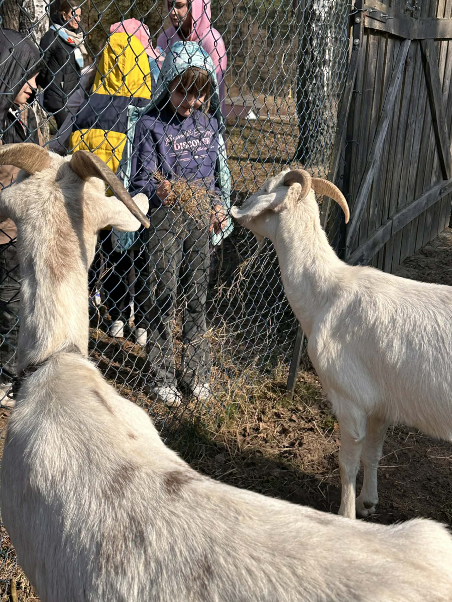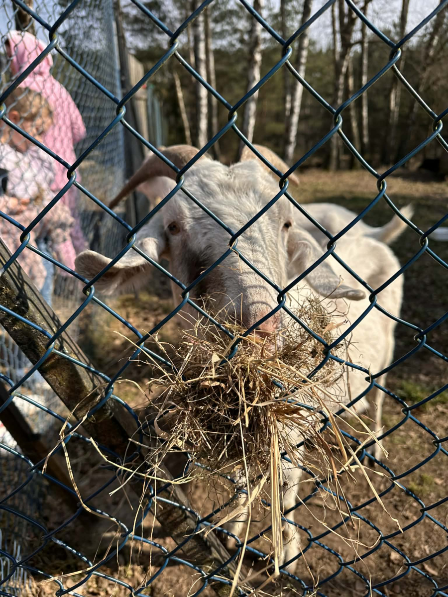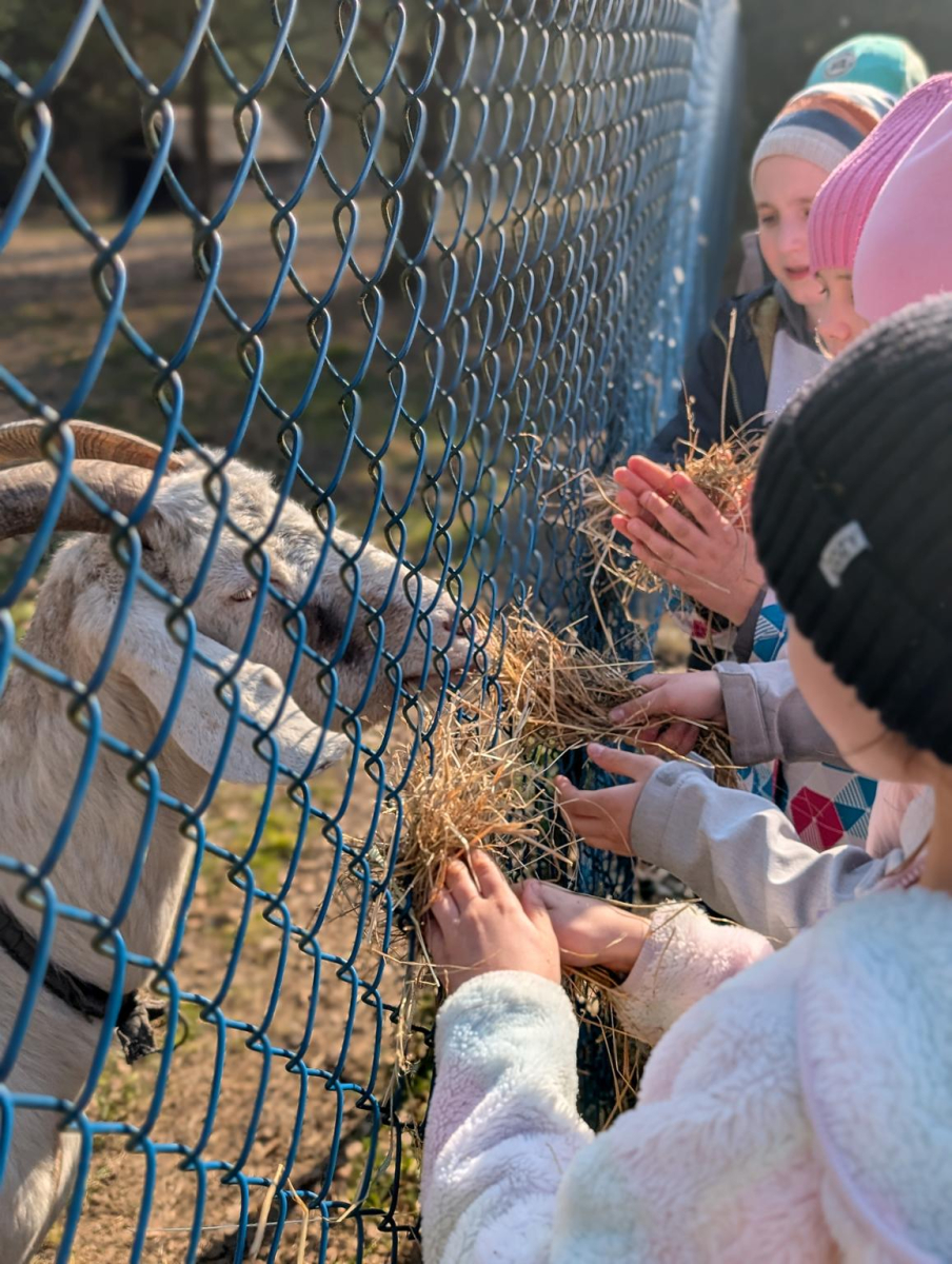 Nie zabrakło też kontaktu z naturą – dzieci dowiedziały się, jak opiekować się zwierzętami, karmiły kozy oraz z radością głaskały królika, kaczuszki i kurczaczki.