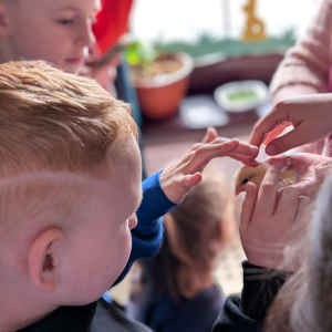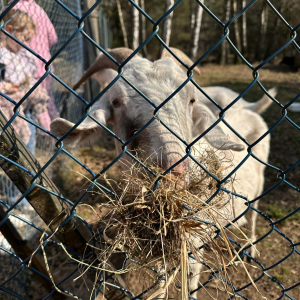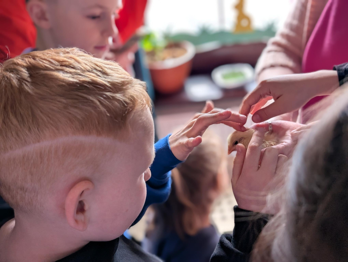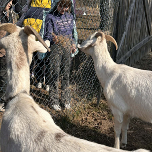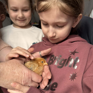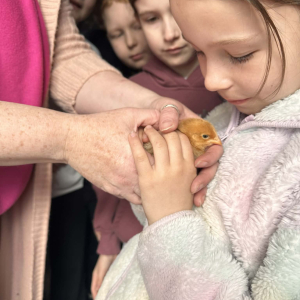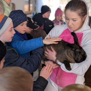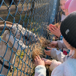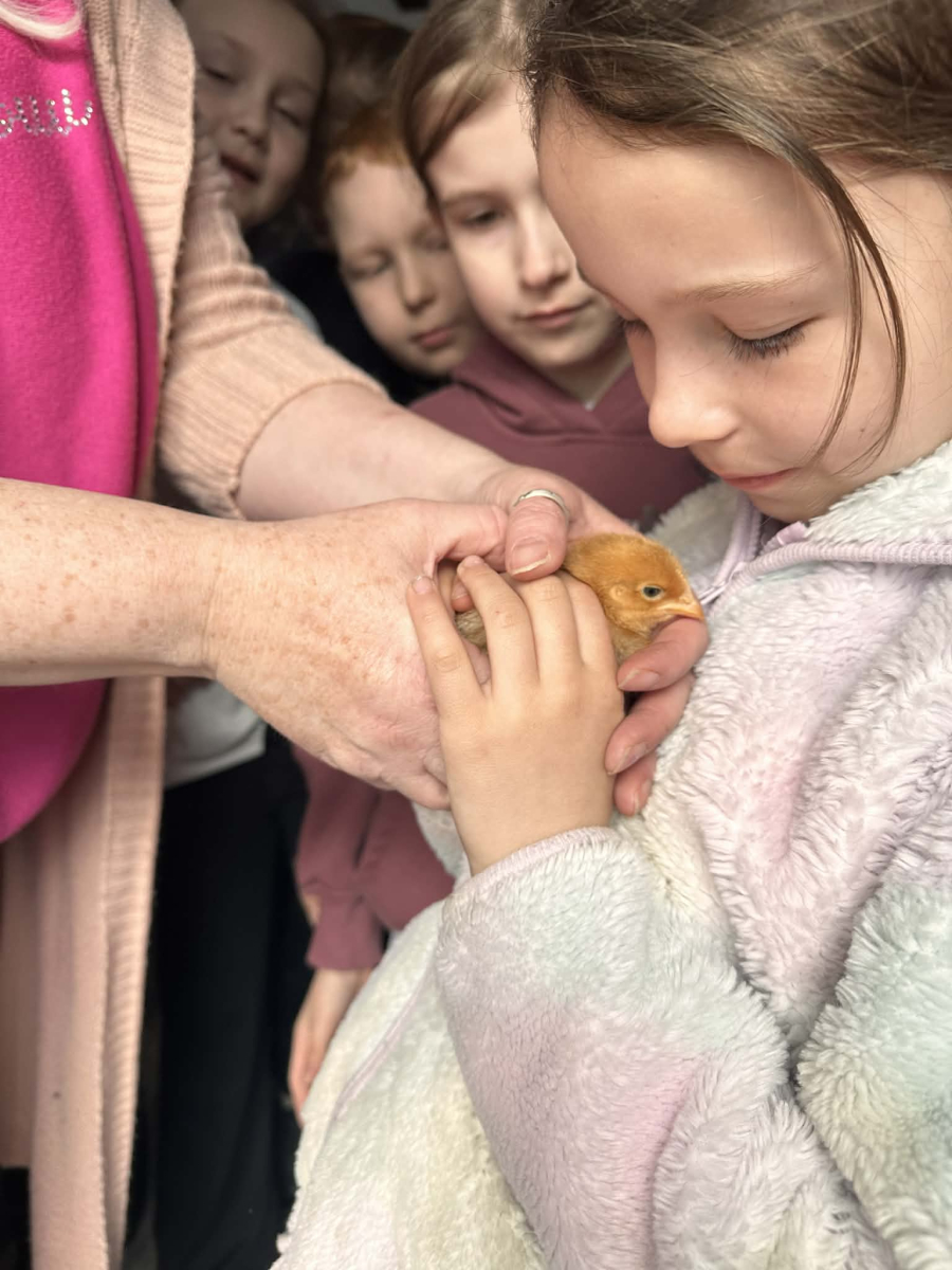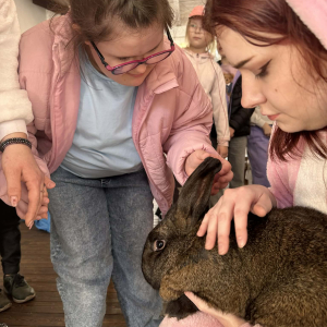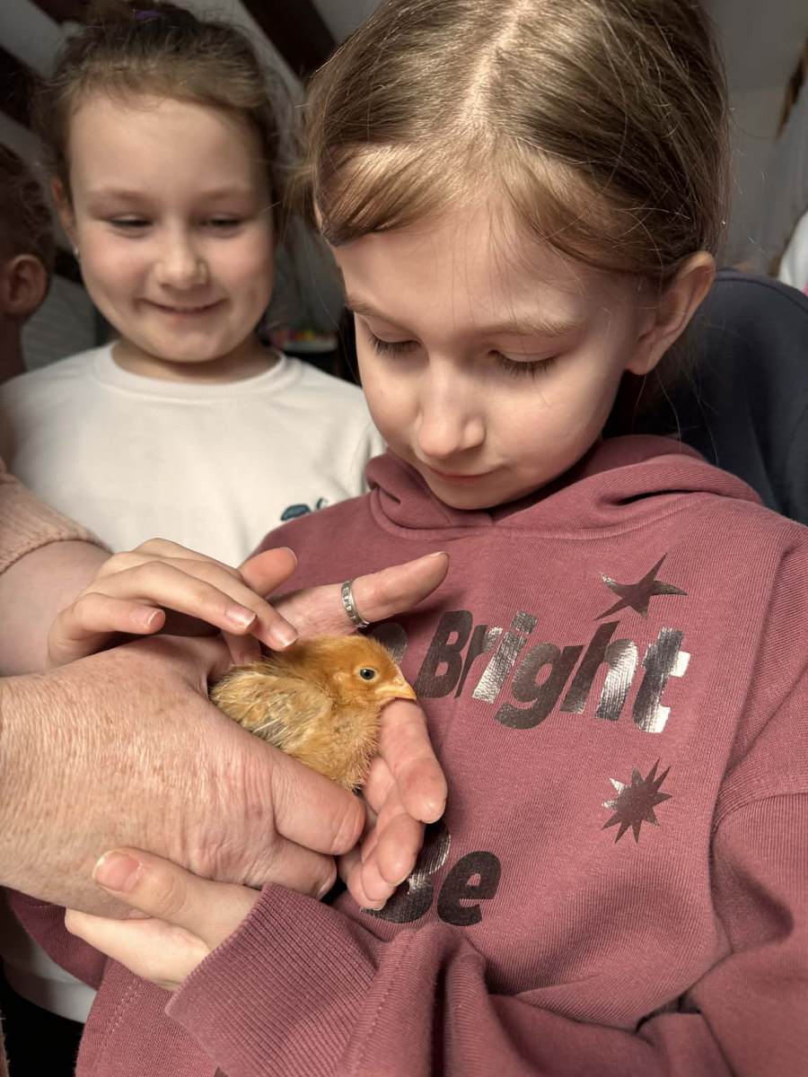 Nie zabrakło też kontaktu z naturą – dzieci dowiedziały się, jak opiekować się zwierzętami, karmiły kozy oraz z radością głaskały królika, kaczuszki i kurczaczki.