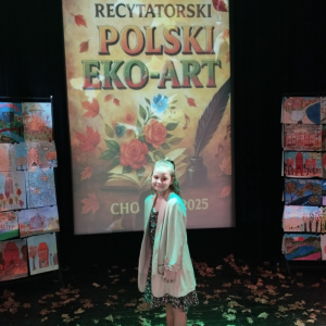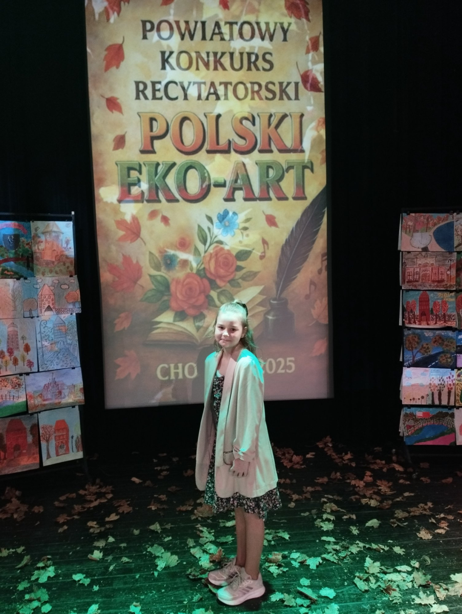 21 października uczennica klasy 3a - Kaja Spierewka wzięła udział w Powiatowym Konkursie Recytatorskim Polski Eko-Art 2025 organizowanym przez Chojnickie Centrum Kultury. Kaja do recytacji wybrała wiersz Aliny Zwoźniak pt. "Eko, eko- ekologia". W konkursie udział wzięło 45 uczestników, a nasza uczennica otrzymała wyróżnienie II stopnia.