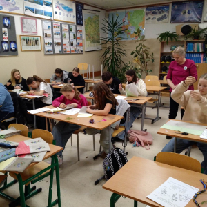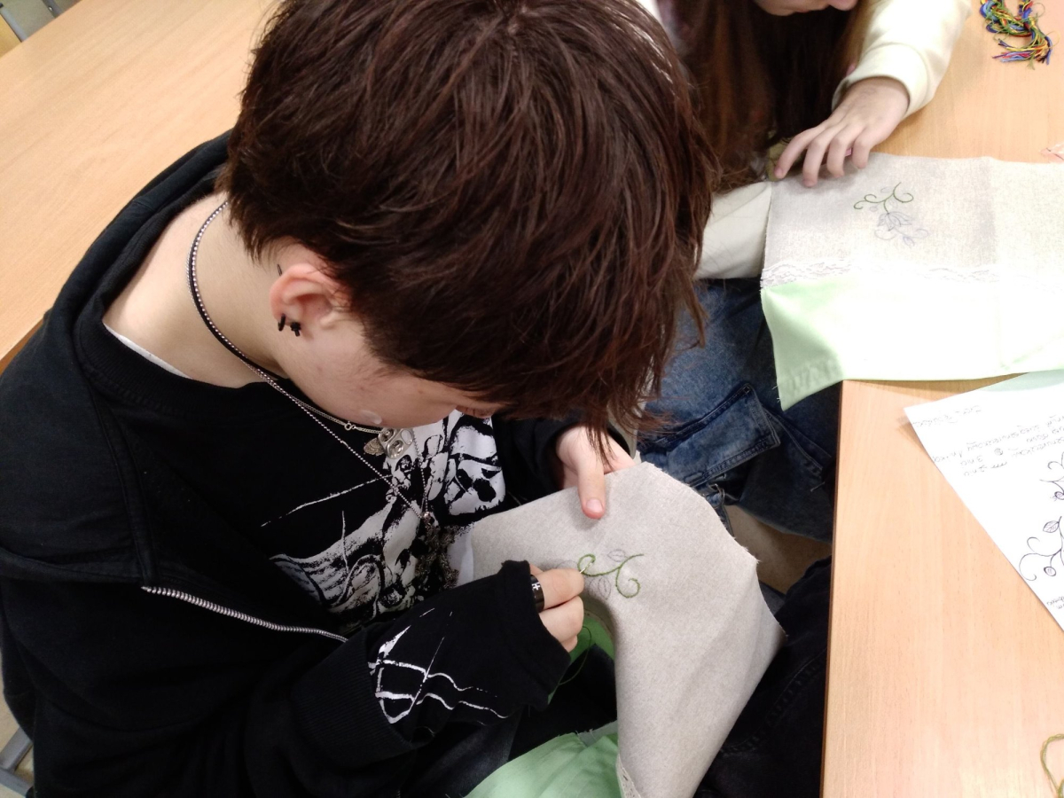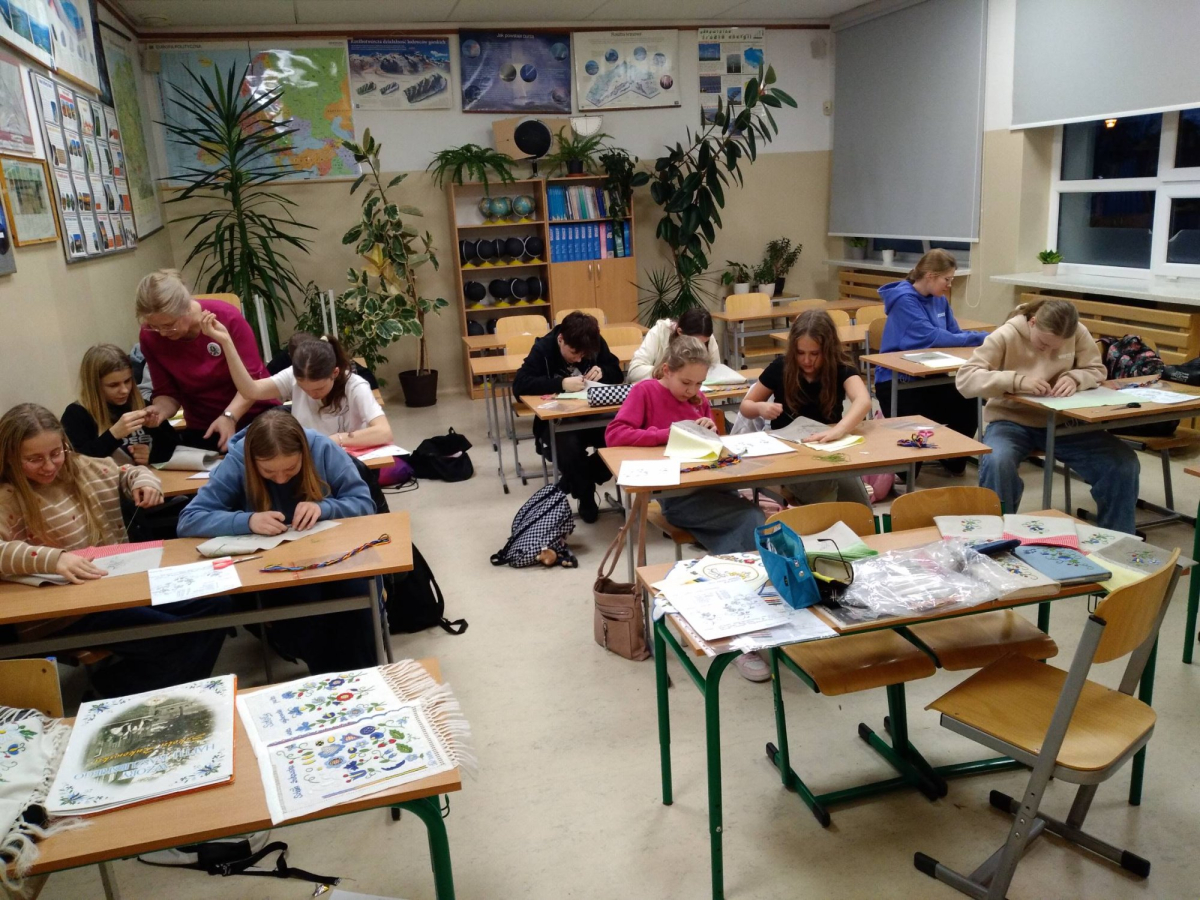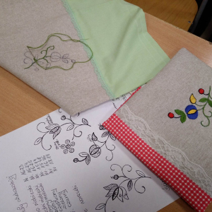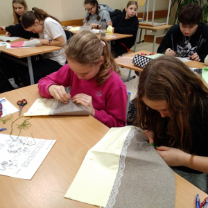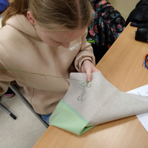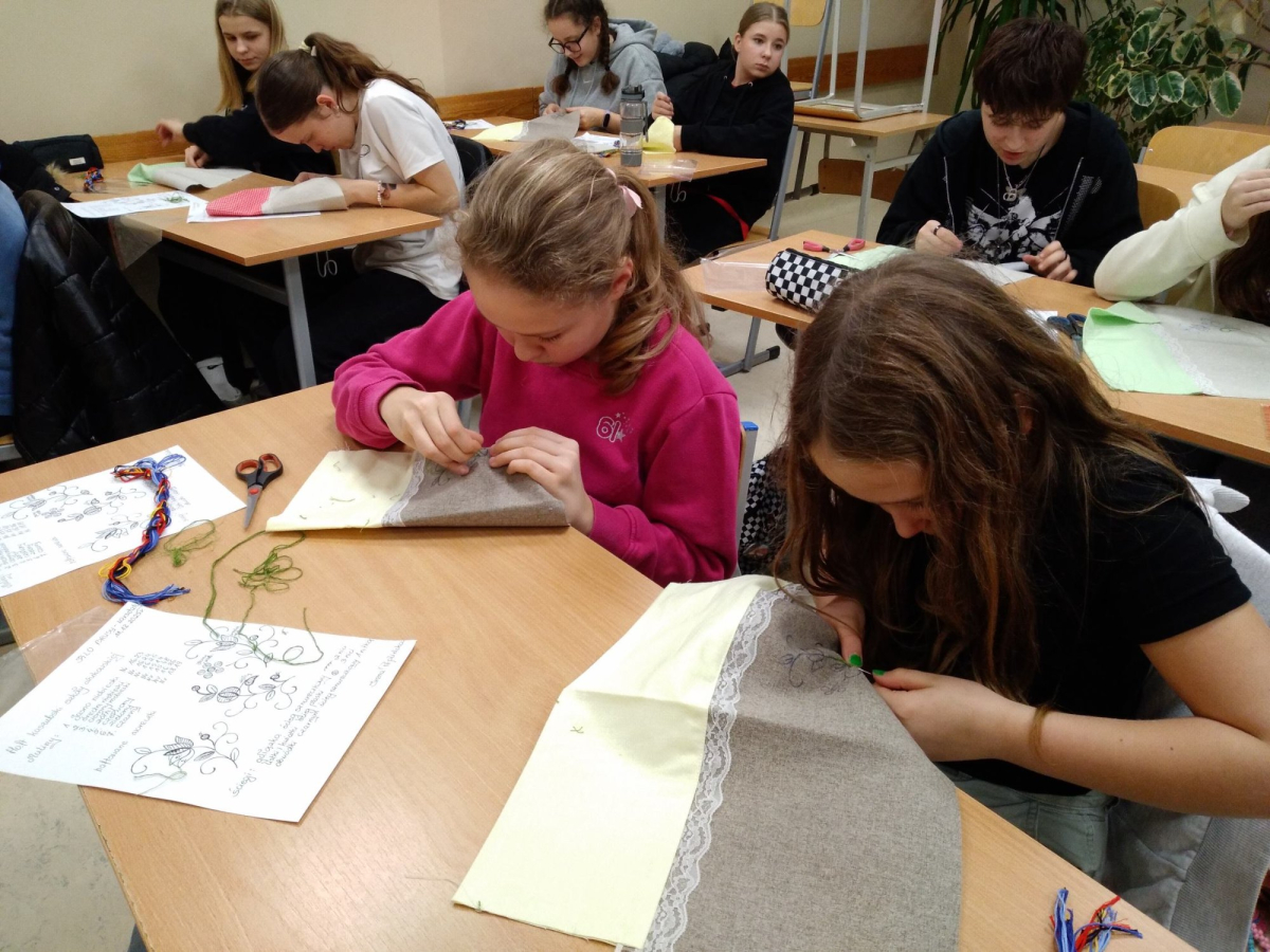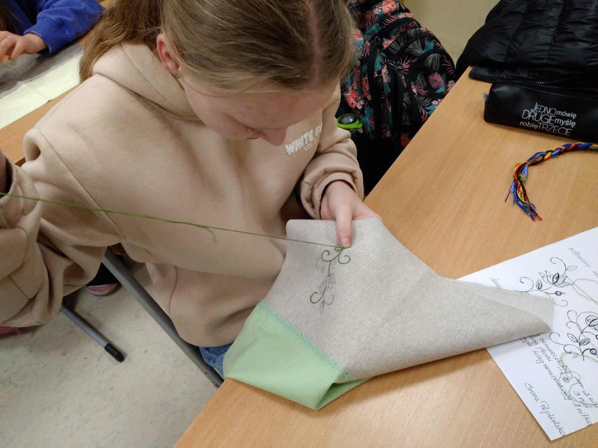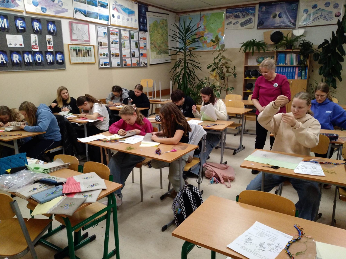 11 grudnia odbyły się w naszej szkole warsztaty z haftu kaszubskiego. Adresowane były do uczniów kl. V-VIII, uczęszczających na język kaszubski. W zajęciach, zorganizowanych przez nauczyciela Grzegorza Schramke, a prowadzonych przez znaną w okolicy hafciarkę Irenę Peplińską, wzięło udział kilkunastu chętnych. Po części teoretycznej nastąpiło to, co najważniejsze – praktyczna nauka „wësziwkù”. Uczniowie, pod czujnym okiem instruktorki, wykonywali swoje pierwsze prace – zdobili woreczek na drobiazgi motywem kwiatka z listkami. A zadanie nie było łatwe! Należało „pilnować” nitki, aby wyszła zgrabna łodyżka, trzeba było pamiętać, że gałązki wyszywamy dwiema niteczkami, a listki trzema, itd., itd. Pełna „profeska” – jak mawiają uczniowie. Stąd i efekty pracy „zacne”. A zajęcia minęły, krótko pisząc, jak z bicza strzelił.