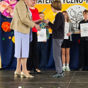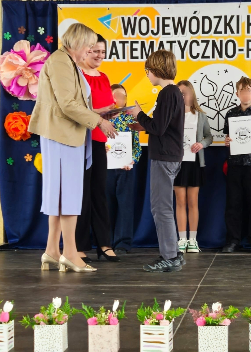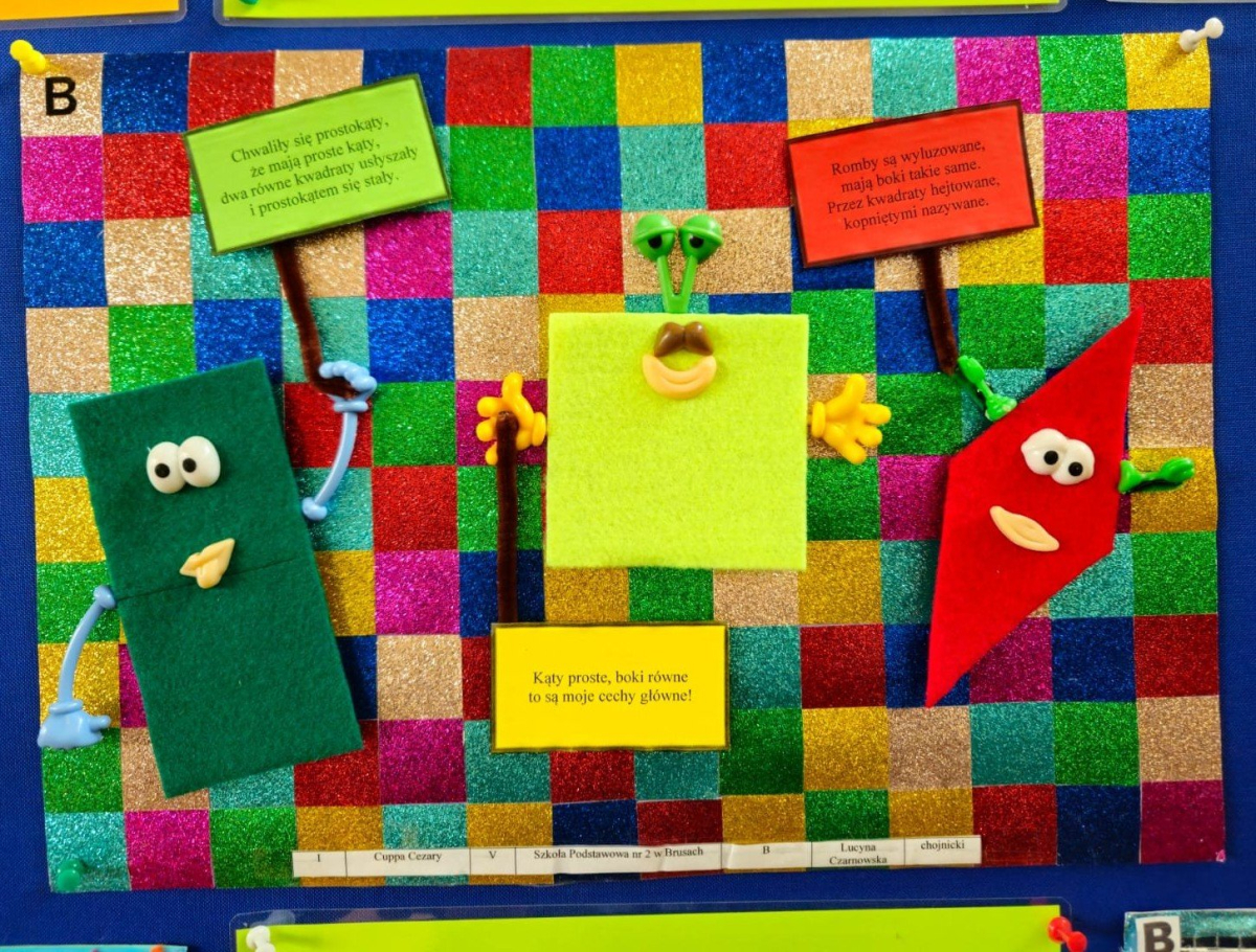 Pierwsze miejsce w XIX Wojewódzkim Konkursie Matematyczno Plastycznym w kategorii klas piątych zdobył Cezary Cuppa z klasy 5B. Tegorocznym zadaniem konkursowym była „Reklama czworokątów”. Uczeń przygotował pracę, która zachwyciła zarówno pomysłowością, jak i matematyczną precyzją.